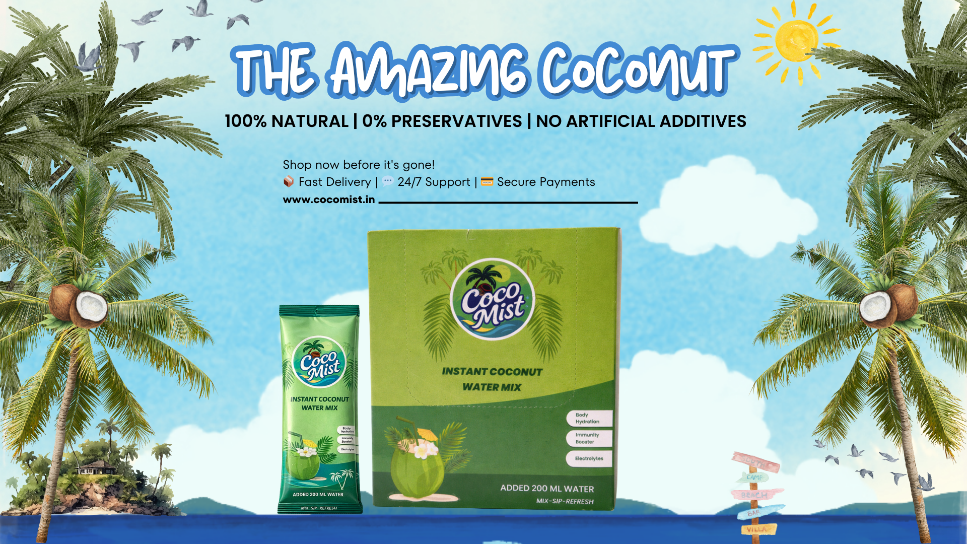 Coco Mist Instant Coconut Water Mix – 100% Natural, 0% Preservatives | Electrolyte-Rich Hydration | 20 Sachets Box